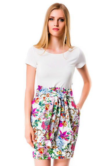 Стильное платье из двух видов ткани: топ выполнен в виде белой однотонной футболки, а юбочная часть "тюльпан" - из яркой цветастой ткани.
